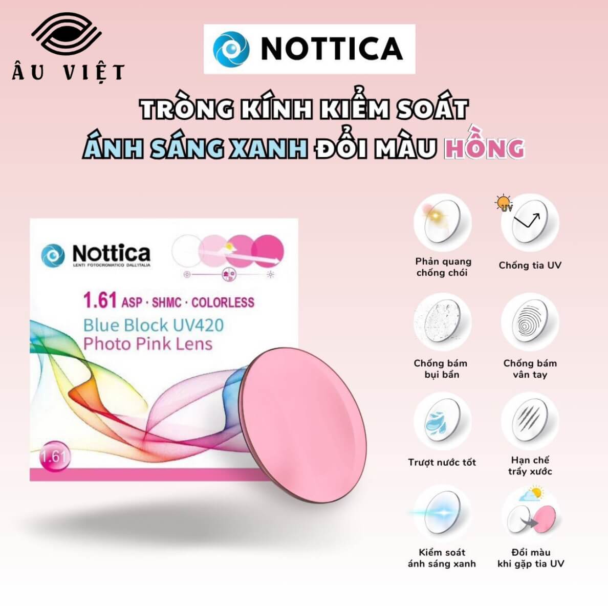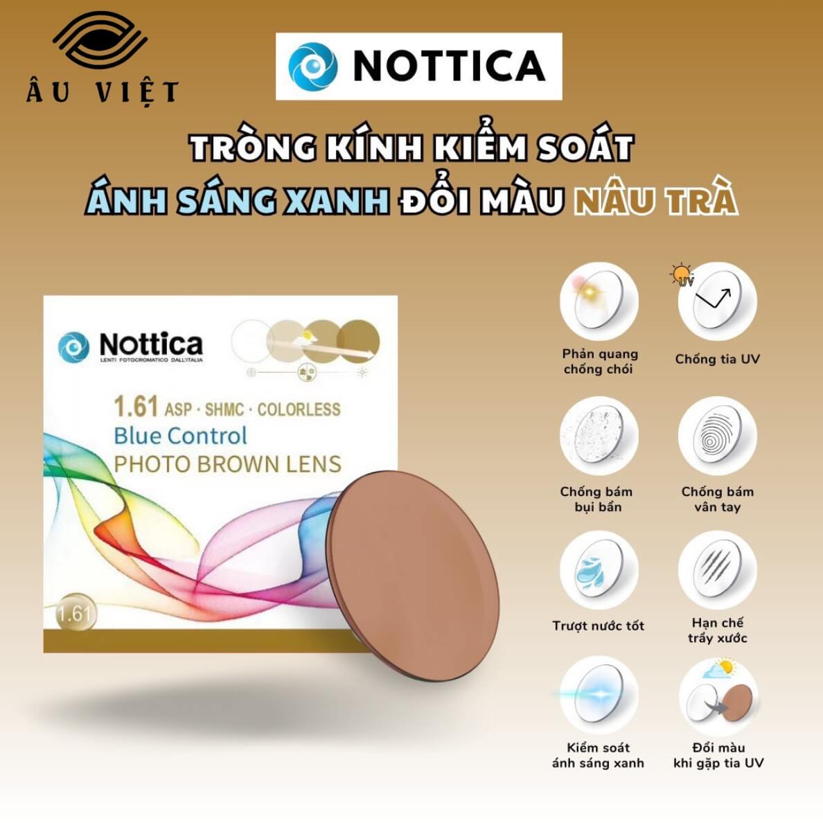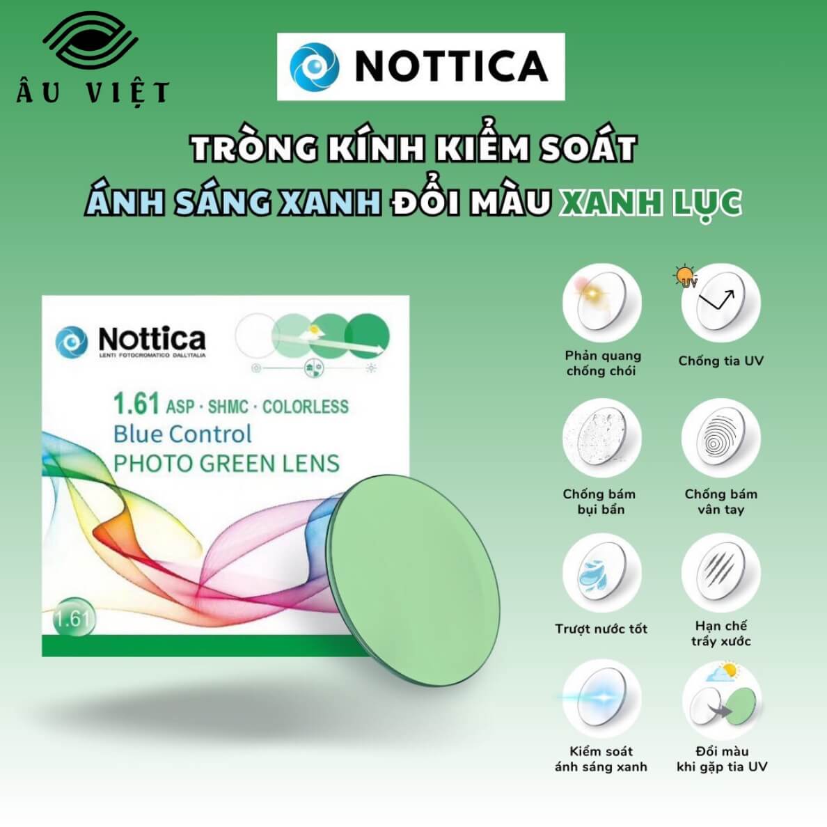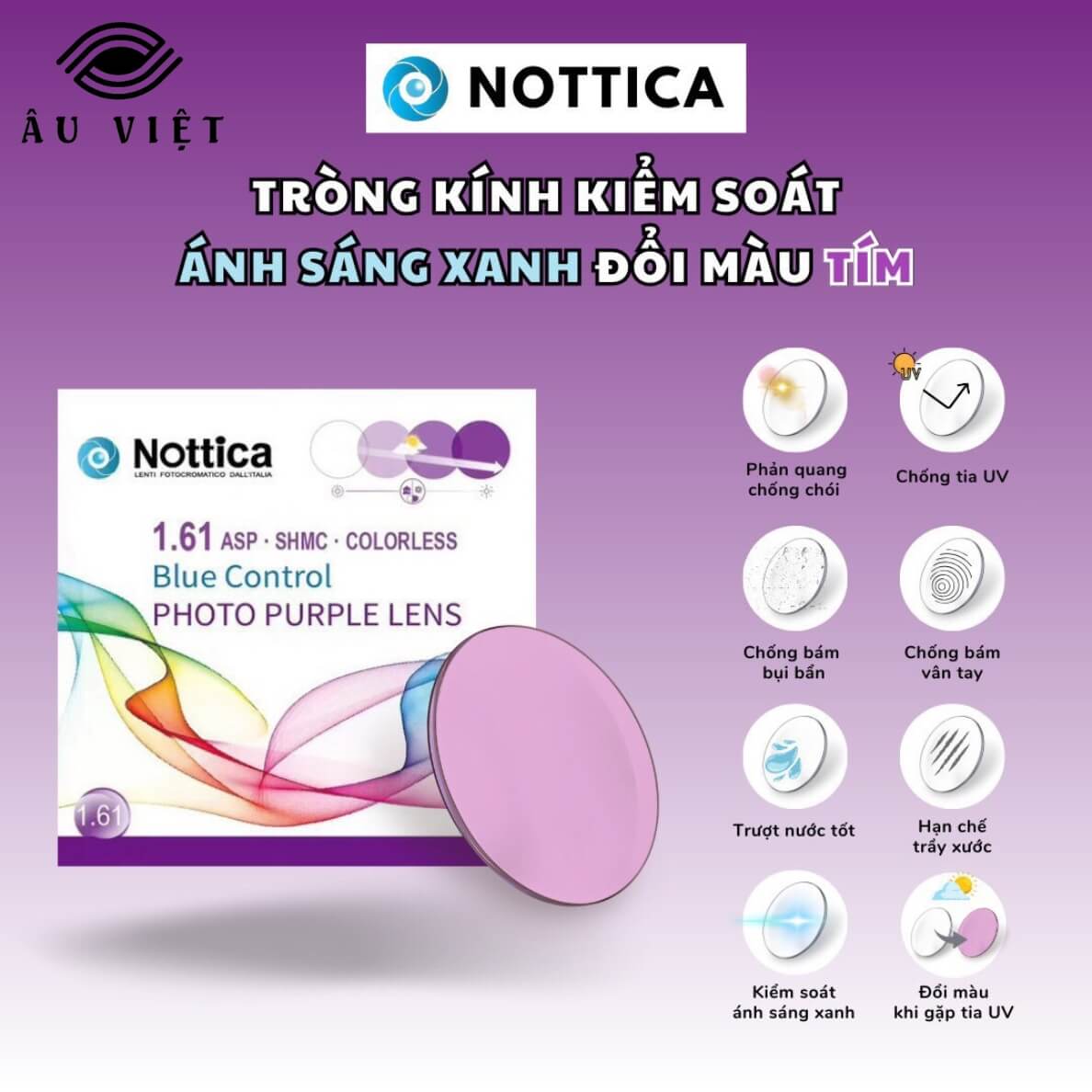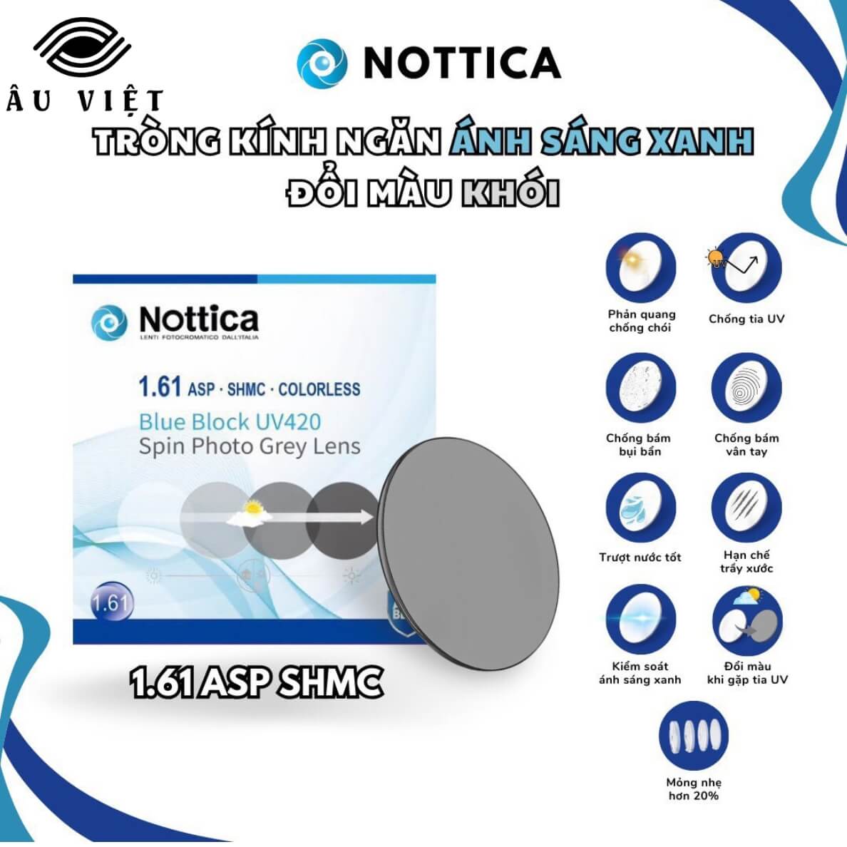 Tròng kính đổi màu Nottica 1.61 ASP Blue Control là dòng sản phẩm cao cấp đến từ thương hiệu Nottica (Ý) – nổi tiếng với thiết kế tinh tế và công nghệ quang học tiên tiến.